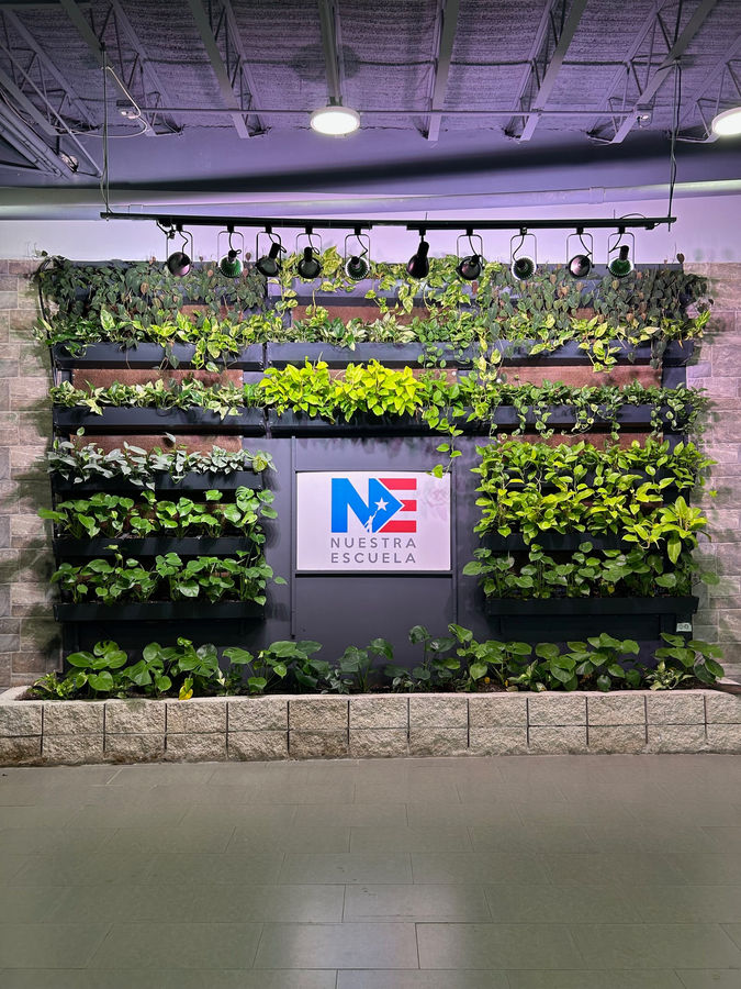 This indoor green wall was designed to enhance learning, wellness, and biodiversity at Nuestra Escuela, a non-profit high school dedicated to inclusive education and holistic development. The installation transforms an ordinary wall into a living system that supports ecological awareness, improves air quality, and promotes student well-being. Native and adaptive plant species, including Philodendron hederaceum micans, create a lush tapestry of foliage that requires minimal maintenance while strengthening local ecosystems. The modular planting system was selected for its sustainability, integrating irrigation and thoughtful species selection to regulate indoor temperature and support year-round growth. More than an aesthetic feature, the wall functions as an interactive learning tool, empowering students to engage hands-on with plant care, biodiversity, and environmental responsibility. This project reflects our belief that landscape architecture can inspire future generations and build healthier, more resilient communities.
